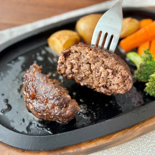 豊かな自然の中で、ゆっくり丁寧に育てられた黒毛和牛と自社法人の農場で出産・育成・出荷までを一貫して行った安心・安全な豚を原料に使用した合い挽きハンバーグ。