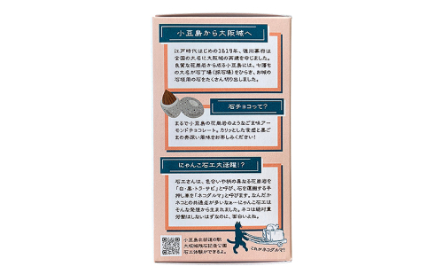 中には大坂城の石垣にも使われた小豆島の「花崗岩」のようなごま味アーモンドチョコレートが入っています。小豆島石の歴史物語を伝えるかわいらしいパッケージとともに、アーモンドのカリッとした食感、黒ごまの風味をお楽しみください。