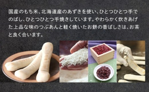 国産のもち米、北海道産のあずきを使い、ひとつひとつ手でのばし、ひとつひとつ手焼きしています。
