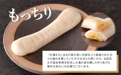 「お滝もち」は467段の長い石段を上り参詣された方々の疲れを癒していただければとの思いから、当店店主が延命長寿を祈念し大滝の姿を模して作りあげた素朴な味わいのお餅でございます。