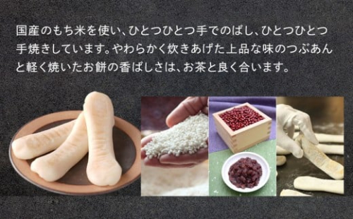 国産のもち米、北海道産のあずきを使い、ひとつひとつ手でのばし、ひとつひとつ手焼きしています。