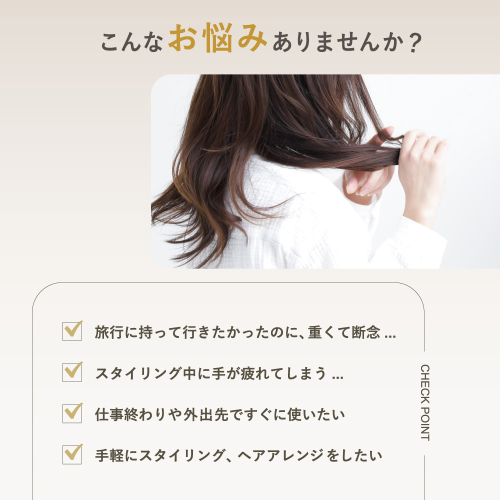 USB充電式のため、使用時はコードレスでOK。仕事終わりのちょっとしたお直しや、お出かけ先でのヘアセットにも便利にお使いいただけます。