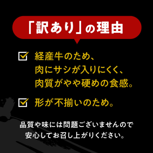 「訳あり」とは、本返礼品は経産牛のため、肉質は硬めですが長く育てた分、噛みしめるたびに和牛本来の旨味をお楽しみいただけます。また、形が不揃いとなります。品質や味には問題ございませんので安心してお召し上がりください。
