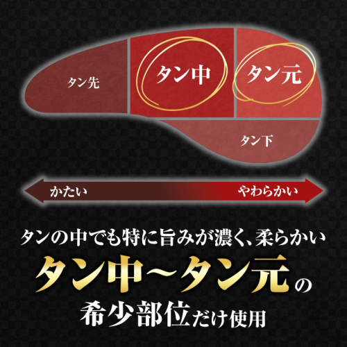 タンの中でも特に旨みが濃く、柔らかい「タン元〜タン中」の希少部位のみを使用しています。