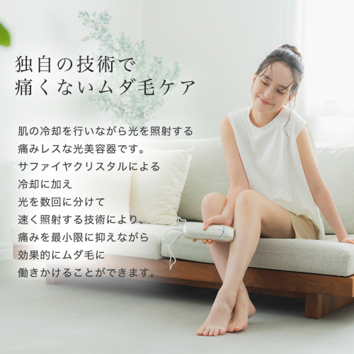 肌の冷却を行いながら光を照射する、痛みレスな光美容器です。サファイヤクリスタルによる冷却に加え、光を数回に分けて速く照射する技術により、痛みを最小限に抑えながら効果的にムダ毛に働きかけることができます。