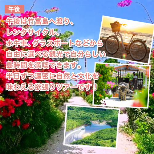 午後は竹富島へ渡り、レンタサイクル、水牛車、グラスボートなどから自由に選べる観光で自分らしい島時間を満喫できます。