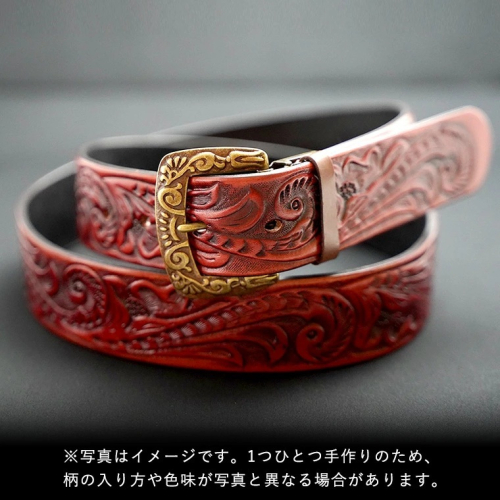 このベルトは、手作業で丸1日かけて柄を彫り、アンティークコードバン染めにて仕上げたものです。図柄は花柄です。