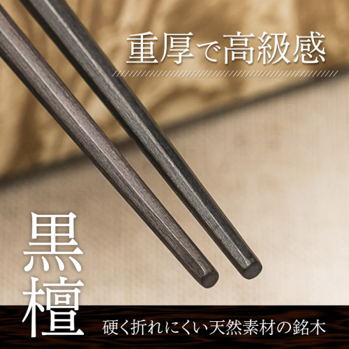 舞鶴の箸職人・吉岡氏が、黒檀と希少材サティーネを使い、素材選定から仕上げまで手作業で仕上げた天丸八角先八角箸。