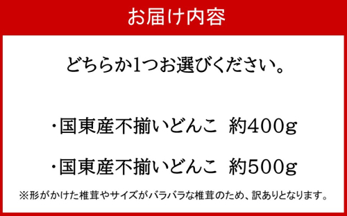\大分県国東市のお品をご覧いただきありがとうございます/ ★大分の「どんこ」椎茸をご紹介! 原木椎茸「どんこ(どんこ)」の中から、肉厚のものを厳選してお届けします。 大分と言えば干し椎茸が有名ですが、中でも産地として評価の高い国東産です。 食べていただければ、そのレベルの高さを実感いただけると思います。 ★お礼の品内容 以下の容量からお選びください。 国東産不揃いしいたけ約400g(どんこ) ※形がかけた椎茸やサイズがバラバラな椎茸のため、訳ありとなります。 国東産不揃いしいたけ約500g(どんこ) ※形がかけた椎茸やサイズがバラバラな椎茸のため、訳ありとなります。 ★お礼の品提供事業者 大分乾物有限会社