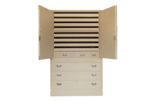 上段の扉内部には横並びの3ツの小引出しと8段の衣装お盆が入り、沢山のお着物と小物が収納できます。