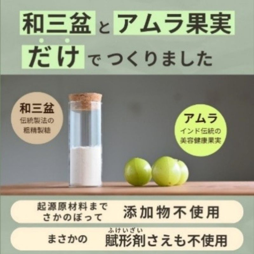 香川県産の高級和三盆糖と、アーユルヴェーダで知られるスーパーフード「アムラ(ユカン)」のみを使用。保存料・香料・着色料・賦形剤など、一切の添加物を使わず、職人の手で一粒ずつ丁寧に仕上げました。天然のビタミンCが豊富なアムラの恵みを、さわやかな酸味のくちどけお菓子に仕立てました。おやつ感覚で摂れるので、毎日の健康習慣に無理なく続けられます。自然素材にこだわる方や、添加物を避けたい方、手作りのあたたかみを大切にしたい方におすすめです。
