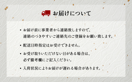 ※上記、発送前のご連絡は、お申込者にいたしますので、お申込者とお届け先が違う場合は、必ずお届け先様(お受取人様)にご連絡頂き、お受け取りの準備をお願いします。