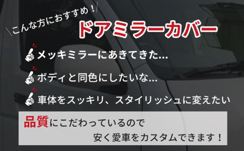 【スピード発送(7日以内)のお礼品のため、不在日は承れません。】 ボディカラーと合わせたカスタムが可能!両面テープ付きで簡単に取り付けができます。 カラー:209 ブラックマイカ ※走行中の落下防止のため、作業前には接着面の脱脂作業を行ってください。 【適合車種】 トヨタ ハイエース 200系 1型~5型までのミラーに対応 標準・ワイドボディ車適合 ※グレードによりミラー形状が異なるためお間違えのないようお願いします。 【車検に関して】 検査員の見解、車体の個体差、測定の仕方により、判断基準が異なる場合があります。 事前に管轄の陸運局へご確認下さい。