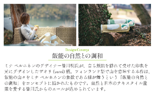 ミナ ペルホネンのデザイナー皆川明氏が飯能を訪れ、自然の風景から着想を得て描いた「ヴオリ柄」。フィンランド語で”山”を意味するこの柄は、静けさと心地良さを併せ持つ佇まい。ファインウールとカシミアを絶妙にブレンドしたブランケットは、肌触りの良さと保温性を兼ね備え、日常に上質な温もりを添えます。ふるさと納税の返礼品として特別な一枚をお届けします。