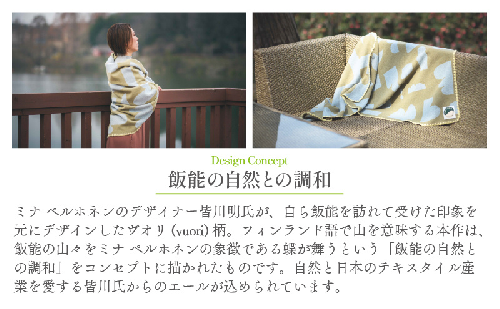 ミナ ペルホネンのデザイナー皆川明氏が飯能を訪れ、自然の風景から着想を得て描いた「ヴオリ柄」。フィンランド語で”山”を意味するこの柄は、静けさと心地良さを併せ持つ佇まい。ファインウールとカシミアを絶妙にブレンドしたブランケットは、肌触りの良さと保温性を兼ね備え、日常に上質な温もりを添えます。ふるさと納税の返礼品として特別な一枚をお届けします。