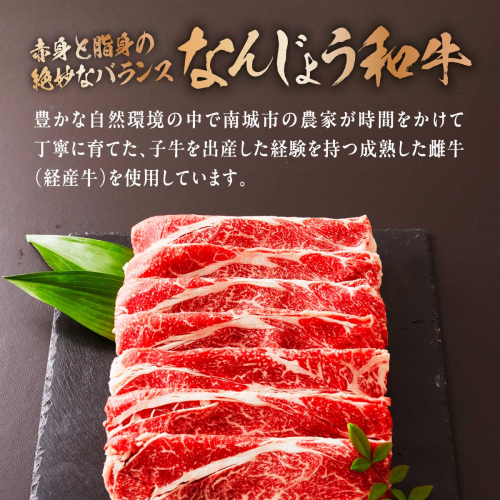 ハートのまち南城市のなんじょう和牛生産組合員が、まごころ込めて育てた「なんじょ う和牛」 南城市の豊かな土地の恵みを受けた牧草を食べ肥育した黒毛和種の経産牛(子牛を産ん だ経験のあるお母さん牛) 格付け等級2級以上で、脂身が少なく独特な風味と旨みがあります。 ※本品は、様々な部位(もも、うで、バラなど)を使用しており、切り落としの為、肉片の大きさにばらつきや赤身・ 脂身の割合に偏りがあります。