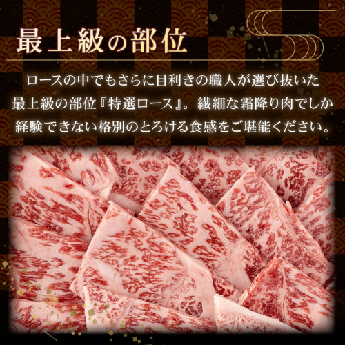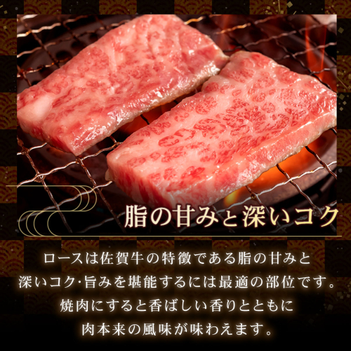 「ロース」は牛肉の脂の甘みとコクの深い旨味を楽しむには最適の部位です。 きめ細やかな霜降りが特徴で、非常に柔らかく口の中でとろけるような食感が楽しめます。 最上級部位での特選焼肉をぜひご堪能ください。 【地場産品基準に該当する理由】 8号ハ:佐賀県認定地域資源:佐賀牛