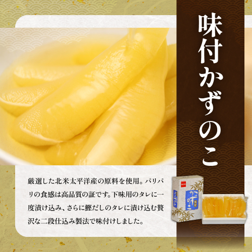 数の子をふんだんに使用し、昆布とイカの旨味を引き出す秘伝のタレに漬け込みました。