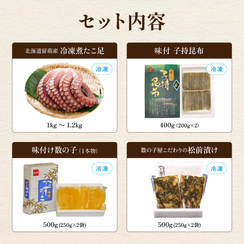 たこ、数の子、子持ち昆布、数の子松前漬けをセットにしたお正月にぴったりなセットです!