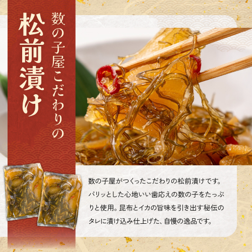数の子をふんだんに使用し、昆布とイカの旨味を引き出す秘伝のタレに漬け込みました。