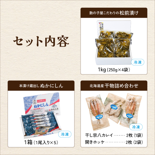 数の子(アメリカ)、醤油調味液 (還元水飴、米発酵調味料、 醤油、 植物たん白加水分解物、砂糖、魚介エキス、イソマルトオリゴ糖シロップ、食塩)、刻み昆布、水あめ・砂 糖混合異性化液糖、発酵調味液 (米発酵調味料、醸造酢)、刻みいか(いか、砂糖調味料、 食塩、醸造酢)、唐辛子/酒精、 ソルビット、調味料(アミノ酸等)、増粘多糖類、酢酸、 酸味料、リン酸塩(Na)、(一部に小麦・いか・さば 大豆を含む)