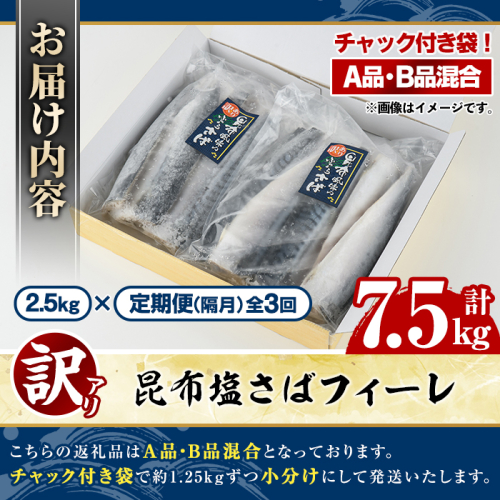 <定期便(隔月)・全3回>訳あり!昆布塩さばフィーレ(A品B品混合・計7.5kg) 大容量 ボリューム サバ 鯖 おかず おつまみ 惣菜 焼き魚 切り身 昆布 ご家庭用 リピート 定期便 【グローバルフーズ】akn061-25