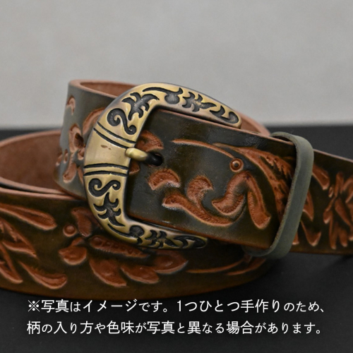 このベルトは、手作業で丸1日かけて柄を彫り、フラワーオリーブグリーン染めにて仕上げたものです。