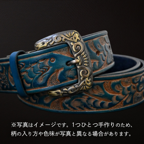 自然の中を歩いて得たエネルギーを商品に落とし込んで、1つ1つ手作りしています。 このベルトは、手作業で丸1日かけて柄を彫り、紺のかすれ染めにて仕上げたものです。 非常に耐久性に優れており、気取らずデイリーにお使いいただけます。 素材は牛革で、太さ35mm / 厚さ3.7mm / M(110cm) となります。 長さの調整は簡単にできますので、付属の説明書をご覧ください。 ※写真はイメージです。  1つ1つ手作りのため、柄の入り方や色味が写真と異なる場合があります。 【注意事項】 ご使用の前に以下の注意事項を必ずご確認ください。 ※本品は天然素材を使用しております。色ムラ等は、革本来の素材の特性ですので、ご了承ください。 ※色落ちや色移りをする場合がございます。淡色の衣服を着用の際には特にご注意ください。 ※色移りは革の表面、裏面ともにあります。 ※一枚の革の中でも革質は均一ではありません。シワやキズの入り具合も異なりますので特性をご理解の上ご使用ください。