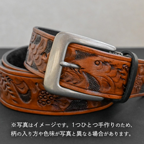 このベルトは、手作業で丸1日かけて柄を彫り、アンティーク調に焦茶染めにて仕上げたものです。