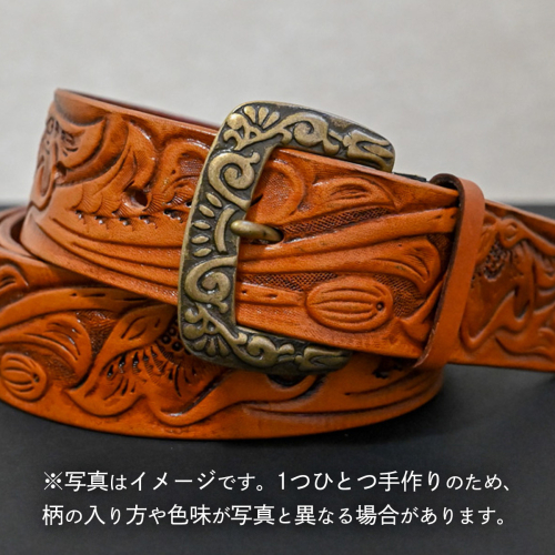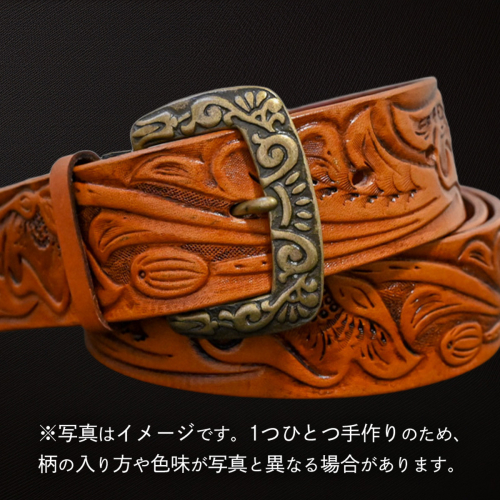 このベルトは、手作業で丸1日かけて柄を彫り、アンティーク調にタン染めにて仕上げたものです。