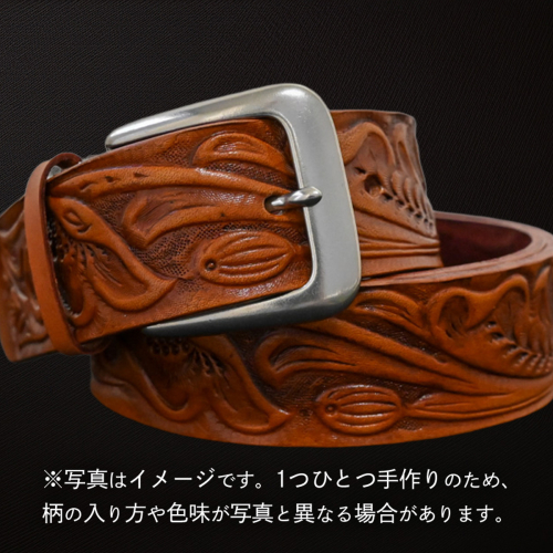 自然の中を歩いて得たエネルギーを商品に落とし込んで、1つ1つ手作りしています。 このベルトは、手作業で丸1日かけて柄を彫り、アンティーク調に茶染めにて仕上げたものです。 非常に耐久性に優れており、気取らずデイリーにお使いいただけます。 素材は牛革で、太さ40mm / 厚さ3.7mm / L(130cm) となります。 長さの調整は簡単にできますので、付属の説明書をご覧ください。 ※写真はイメージです。  1つ1つ手作りのため、柄の入り方や色味が写真と異なる場合があります。 【注意事項】 ご使用の前に以下の注意事項を必ずご確認ください。 ※本品は天然素材を使用しております。色ムラ等は、革本来の素材の特性ですので、ご了承ください。 ※色落ちや色移りをする場合がございます。淡色の衣服を着用の際には特にご注意ください。 ※色移りは革の表面、裏面ともにあります。 ※一枚の革の中でも革質は均一ではありません。シワやキズの入り具合も異なりますので特性をご理解の上ご使用ください。