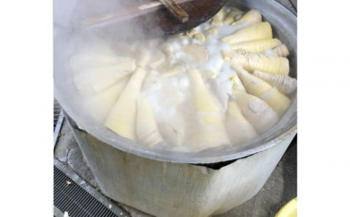 朝掘った筍が昼には当農園の大釜で時間をかけて一気に茹でられます。