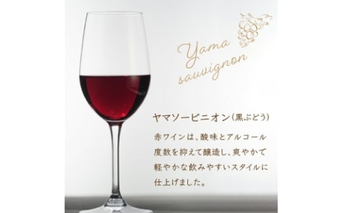赤ワインは、酸味とアルコール度数を抑えて醸造し、爽やかで軽やかな飲みやすいスタイルに仕上げました。使っている品種は[黒ぶどう・ヤマソービニオン]です。