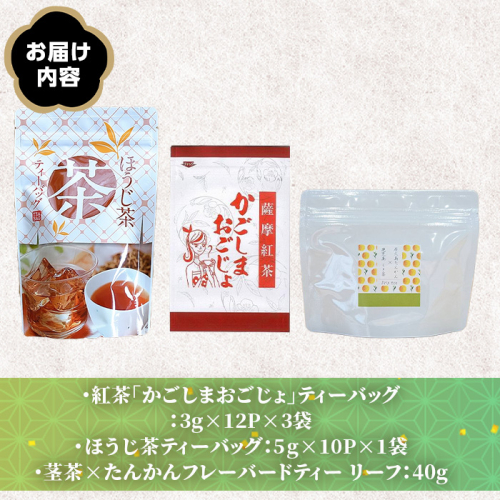 日置市 特産品 国産 九州産 鹿児島県産 日本茶 お茶 紅茶 ほうじ茶 フレーバー ティー セット たんかん 茎茶 無糖 簡易包装 数量限定 常温 常温保存
