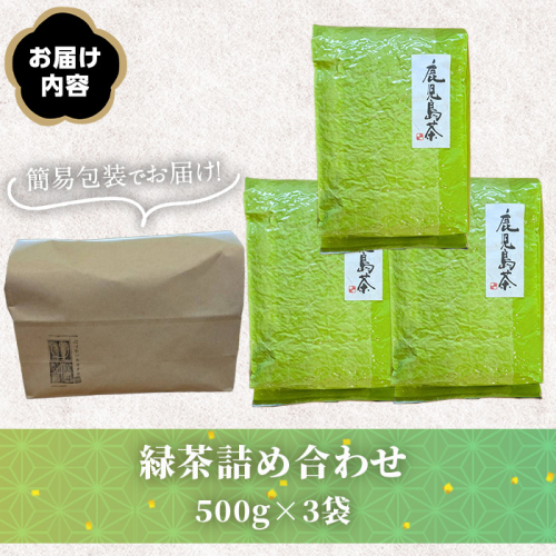 No.1331 <訳あり>日置市産!緑茶詰め合わせ(500g×3袋) 国産 九州産 鹿児島県産 日本茶 お茶 緑茶 簡易包装 訳あり 自宅用 数量限定 常温 常温保存【池田製茶】
