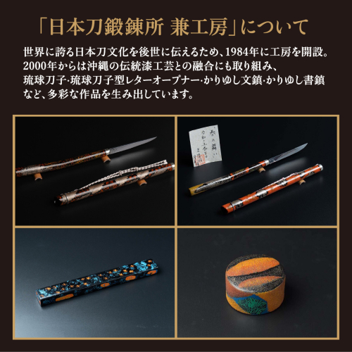2000年からは沖縄の伝統漆工芸との融合にも取り組み、琉球刀子・琉球刀子型レターオープナー・かりゆし文鎮・かりゆし書鎮など、多彩な作品を生み出しています。