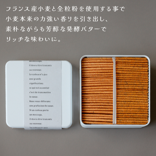 フランス産小麦と全粒粉を使用する事で小麦本来の力強い香りを引き出し、素朴ながらも芳醇な発酵バターでリッチな味わいに。