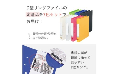 - リングファイル (D型) 7色 アソート 各色1冊 計7冊 (白・クリヤー・赤・黄・黄緑・青・黒) 書類ファイル 2穴 A4サイズ