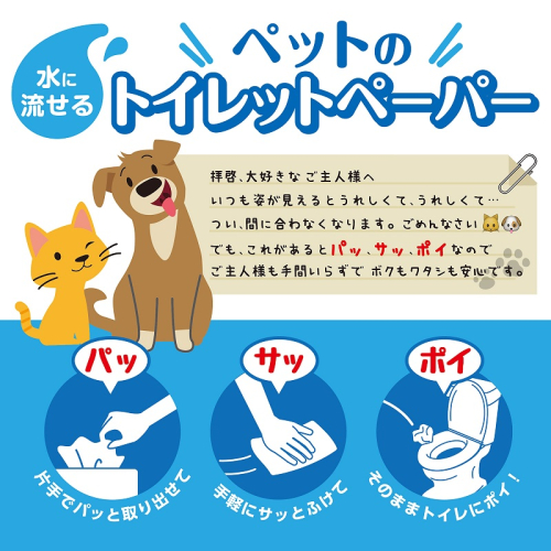 環境にやさしい再生紙100%の水に流せるペット向けのトイレットペーパーです。 トイレットロールと違い、すぐに片手でとれるためペットがトイレをした後に直ぐに簡単に処理できます。 水に流せるため、排泄物と一緒にご自宅のトイレに流すことができます。 エンボス加工をし、厚手につくってあるのでしっかり使えます。 お散歩時の持ち運び、室内犬のトイレ、拭き掃除等色々な場面で使えます。 チリ紙やトイレットペーパーを現在お使いの方は是非使ってみてください。世界が変わります。