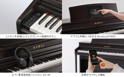 ・カワイ伝統のシーソー式の木製鍵盤を搭載。反りや捻じれが少なく指に吸い付くようなリアルなタッチ。