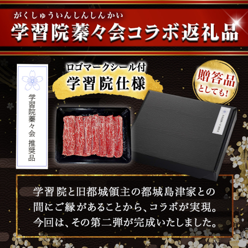 こちらは、『学習院蓁々会(がくしゅういんしんしんかい)』とのコラボ返礼品です。 都城市では、学習院様と旧都城領主である都城島津家との間に縁があることから、学習院蓁々会様とのコラボ返礼品を行っており、このたび、コラボ返礼品の第二弾が完成しました。 都城市といえばお肉。 今回、学習院蓁々会様のロゴマークシールを添えた学習院仕様にてご準備いたしました。 数量限定ですので、贈答品としていかがでしょうか。 すき焼きやしゃぶしゃぶなどの鍋物に! サシ(霜降り)のキメがやや粗く、しっかりとした食感を楽しめます。 牛肉の赤身は、あっさりとした淡泊な味わいで、お肉の脂身が苦手な方にもオススメです。 ※薄切り(スライス)肉のため、網焼きには適しません。 ※赤身肉は脂身が少ない部位のため、火を入れ過ぎると肉質が硬くなってしまうことがあります。