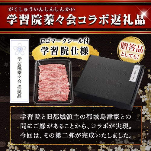 こちらは、『学習院蓁々会(がくしゅういんしんしんかい)』とのコラボ返礼品です。 都城市では、学習院様と旧都城領主である都城島津家との間に縁があることから、学習院蓁々会様とのコラボ返礼品を行っており、このたび、コラボ返礼品の第二弾が完成しました。 都城市といえばお肉。 今回、学習院蓁々会様のロゴマークシールを添えた学習院仕様にてご準備いたしました。 数量限定ですので、贈答品としていかがでしょうか。 “とろけるような柔らかさ”と“口いっぱいに広がる豊かな風味”。 霜が降ったかのように美しく程よく入ったサシは、熱を加えると溶け出し、舌触りの良い柔らかな食感と深い甘みを楽しめます。 オススメの食べ方は、シンプルにしゃぶしゃぶやすき焼き!宮崎牛の濃厚な旨みが、お野菜やお豆腐などの具材を一段と美味しくしてくれます。 ※薄切り(スライス)肉のため、網焼きには適しません。