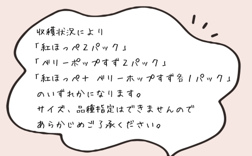 ※収穫状況により「紅ほっぺ2パック」「ベリーホップすず2パック」「紅ほっぺ+ベリーホップすず各1パック」のいずれかになります。サイズ、品種指定はできませんので、あらかじめご了承ください。