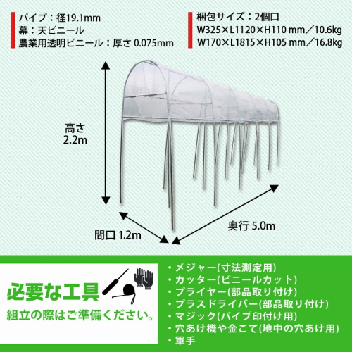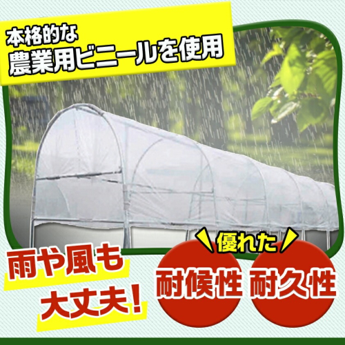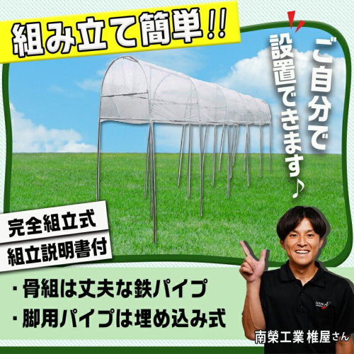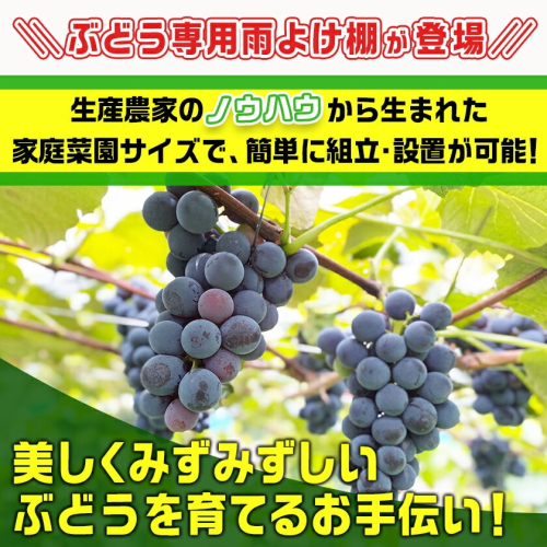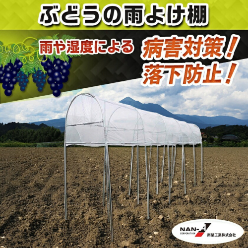 \\ぶどう専用雨よけ棚セットが登場// 雨や湿度による病害対策や落下防止に!ぶどう栽培専用の雨よけ棚です。 生産農家のノウハウから生まれた家庭菜園サイズで、簡単に組立・設置が可能です。 南榮工業の「葡萄の雨よけ棚セット」で、美しくみずみずしいぶどうを育ててください。 ◇−特徴−◇ ・骨組は丈夫な鉄パイプを使用 ・脚用パイプは埋め込み式 ・耐候性と耐久性に優れた農業用ビニール使用 ※組立には工具が必要です。セットには含まれませんので、ご自身でご準備ください。 ・メジャー(寸法測定用) ・カッター(ビニールカット) ・プライヤー(部品取り付け) ・プラスドライバー(部品取り付け) ・マジック(パイプ印付け用) ・穴あけ機や金こて(地中の穴あけ用) ・軍手 ※強風時はビニールを外してください。