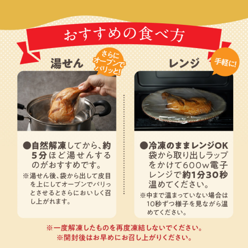 鶏専門店の都城福鳥で焼き上げた、国産若鶏骨付きモモローストチキンレッグです! 国産鶏の骨付きモモ肉を使用し、醤油ベースでニンニクの香りが食欲かきたてる秘伝のタレを中までしっかり染み込ませ、ロースターでじっくり丁寧に焼き上げた福鳥オリジナルのローストレッグ!ぷりぷりで柔らかく、約300gの大きめの骨付きモモ肉は、食べ応えがあり一度食べればやみつきになること間違いなし! 温めるだけで簡単にメイン料理が完成するので、クリスマスやお誕生日、夕食やお酒のおつまみとしても幅広く活躍します。 1本ずつ真空パックの個包装で冷凍便にてお届けします。 ・流水解凍または、4℃~10℃の冷蔵庫で解凍してください。 ・一度解凍したものを再度凍結しないでください。 ・開封後はお早めにお召し上がりください。 ■訳アリの理由 仕入れ状況により、まれに、大きさに多少のバラつきが生じることがありますが、品質には問題ございません。 ご理解の上、お申し込みください。