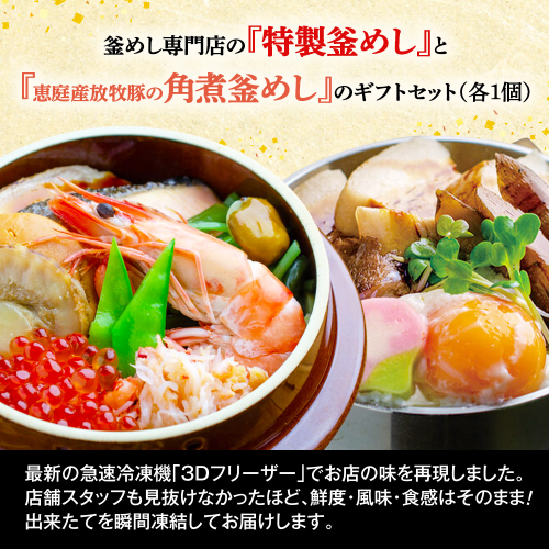 釜めし専門店の『特製釜めし』と『恵庭産放牧豚の角煮釜めし』のギフトセット【280011】
