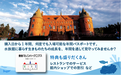 - 登別マリンパークニクス 入場券年間パスポート 大人 1名 【 チケット 北海道 観光 旅行 体験 パーク 入場券 入園券 割引 北海道 水族館 動物園 イルカ アシカ ペンギン パレード】mr-0896