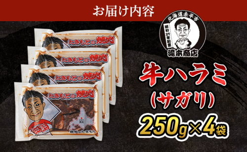 たきもとの牛ハラミ(サガリ)250g×4袋 焼肉 バーベキュー BBQ 牛 牛肉 ハラミ サガリ 冷凍 アウトドア タレ 味付け 北海道 ふるさと納税