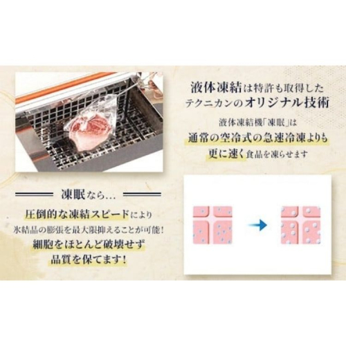 凍結方法にもこだわり、テクニカンのオリジナル技術の液体凍結機を使用して通常の空冷式の急速冷凍よりも更に速く、細胞をほとんど破壊せず、品質を保ちドリップ(旨味成分)を逃すことなく凍結しております。
