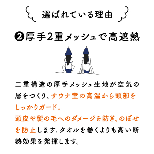 二重構造の厚手メッシュ生地が空気の層をつくり、サウナ室の高温から頭部をしっかりガード。頭皮や髪の毛へのダメージを防ぎ、のぼせを防止します。タオルを巻くよりも高い断熱効果を発揮します。